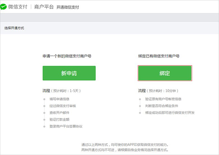 2)绑定:即“绑定已有商户号开通微信支付”,已有商户号的开发者可通过该种方式快速开通微信支付。