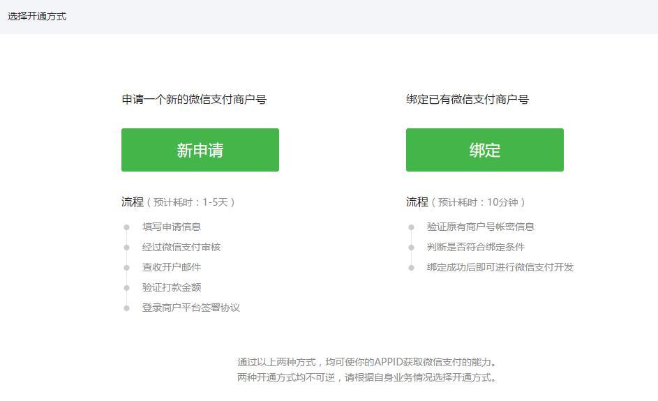 如果之前开通过微信支付,点击绑定即可,否则点击新申请,按要求填写信息,等待通过审核,通常在1-5个工作日内